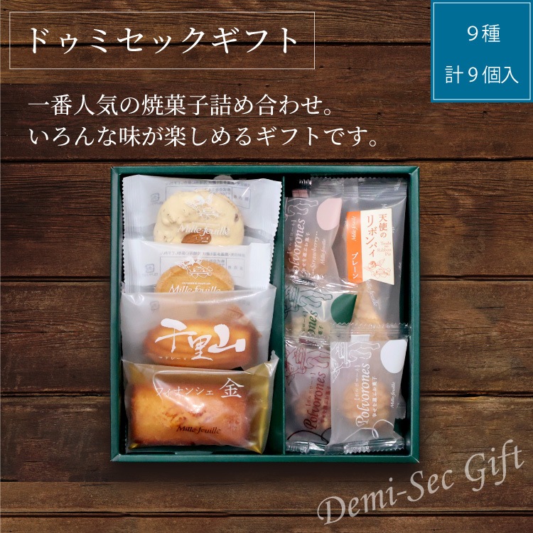 ドゥミセックギフト(DM-12) 内容量 天使のリボンパイプレーン1、プレミアムバタークッキー1、ロッシェアーモンド1、ポルポローネ(プレーン・チョコ・いちご・抹茶)各1、千里山マドレーヌ1、フィナンシェ金1。 原材料名 アレルギー 保存方法 直射日光を避け、常温で保管 賞味期限 商品到着後30日以上 配送方法 常温 備考 こんな用途で 進物 御使い物 お礼 ご挨拶 御礼 ご祝儀 祝儀の品 お使い物 ノベルティー 粗品 景品 誕生日 敬老の日 バースデー 結婚記念日 お年賀 パーティー お中元 お歳暮 母の日 父の日 御祝い 内祝い お返し クリスマス イベント