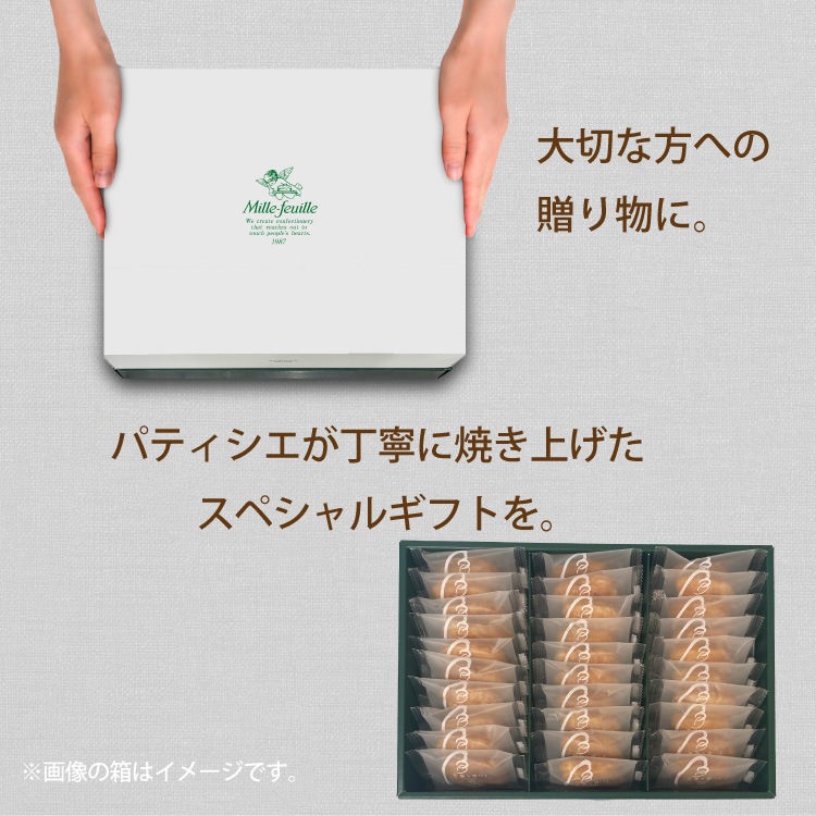 天使の羽をかたどったミルフィーユのオリジナルパイです。パイ本来のサクサクとした食感とバターの香ばしさを大切に、一枚一枚丁寧に焼き上げました。