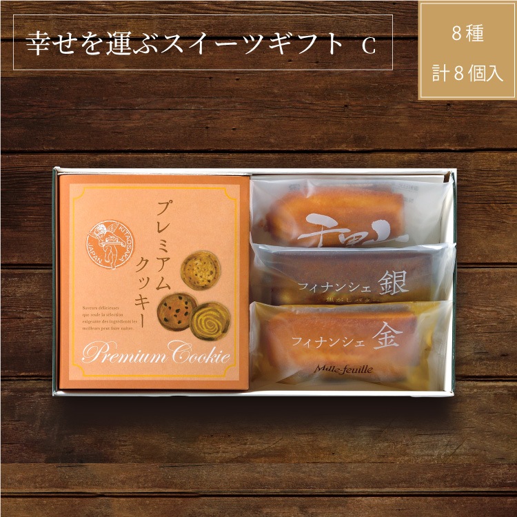 幸せを運ぶスイーツギフトc 内容量 フィナンシェ金 1個 フィナシェ銀 1個 千里山マドレーヌ 1個 プレミアムクッキー5枚入ーA 1箱 原材料名 アレルギー 小麦・乳・卵・大豆・アーモンド 保存方法 直射日光・高温多湿を避けて保存 賞味期限 商品到着後30日以上 配送方法 常温 備考 こんな用途で 進物 御使い物 お礼 ご挨拶 御礼 ご祝儀 祝儀の品 お使い物 ノベルティー 粗品 景品 誕生日 敬老の日 バースデー 結婚記念日 お年賀 パーティー お中元 お歳暮 母の日 父の日 御祝い 内祝い お返し クリスマス イベント