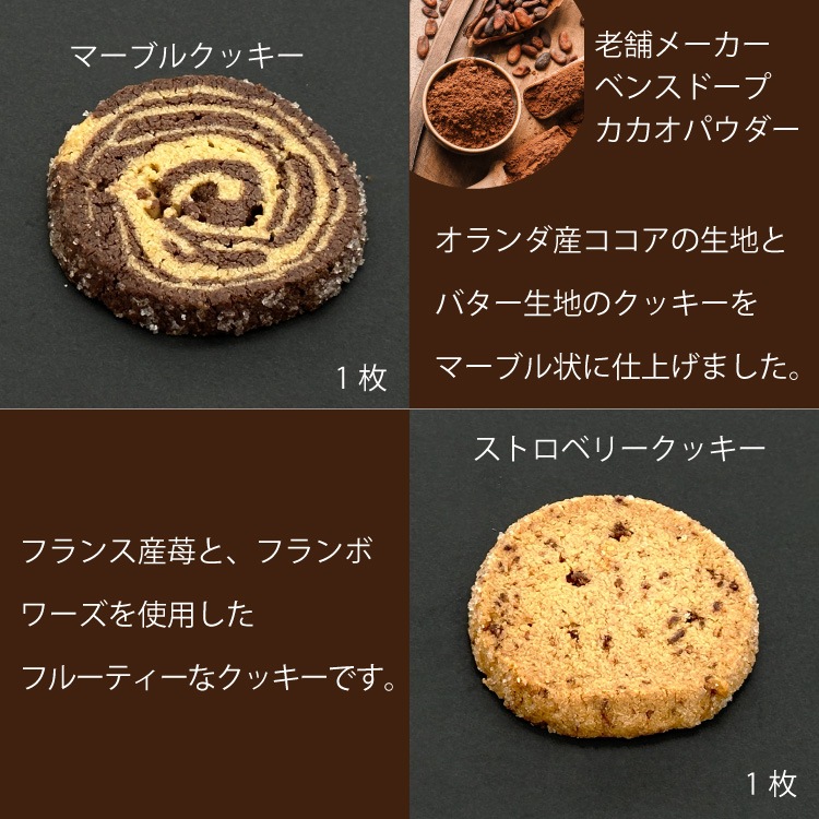 プレミアムクッキー詰合せ(PR-S) 内容量 プレミアムクッキー(バター・ココナッツ・マーブル・ストロベリー)各1、ココナッツミルク4個入り1、カントリークッキー(ごま)3枚1、ロッシェ(アーモンド・ヘーゼル) 原材料名 バター:バター(国内製造)、小麦粉、砂糖、アーモンド、卵、脱脂粉乳、植物油脂(大豆を含む)、塩、牛乳/香料