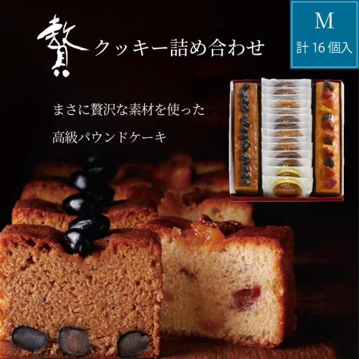 贅・クッキー詰め合わせM 内容量 黒丹波1本、彩果実1本、カントリークッキー黒ごま2枚、カントリークッキーチョコナッツ3枚、カントリークッキーココナッツ3枚、カントリークッキーナッツ2枚、カントリークッキーシナモン2枚、ブルトン2枚 原材料名 贅~黒丹波:黒豆(国内製造)、バター、卵、加工黒糖、小麦粉、砂糖、脱脂粉乳、水飴、アーモンド、洋酒、ブドウ糖シロップ/膨張剤、ゲル化剤(ペクチン)、酸味料、保存料(ソルビン酸K)
