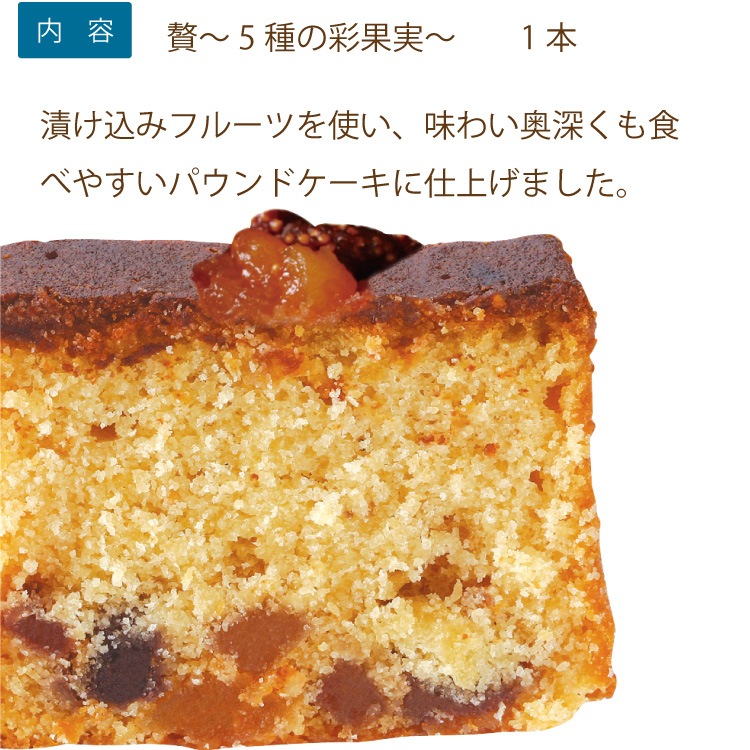 贅~5種の彩果実:バター(国内製造)、卵、砂糖、小麦粉、アーモンド、蜂蜜、苺、パイナップル、リンゴ、いちじく、アプリコット、洋酒、ブドウ糖シロップ/トレハロース、膨張剤、ゲル化剤(ペクチン)、酸味料、保存料(ソルビン酸K)