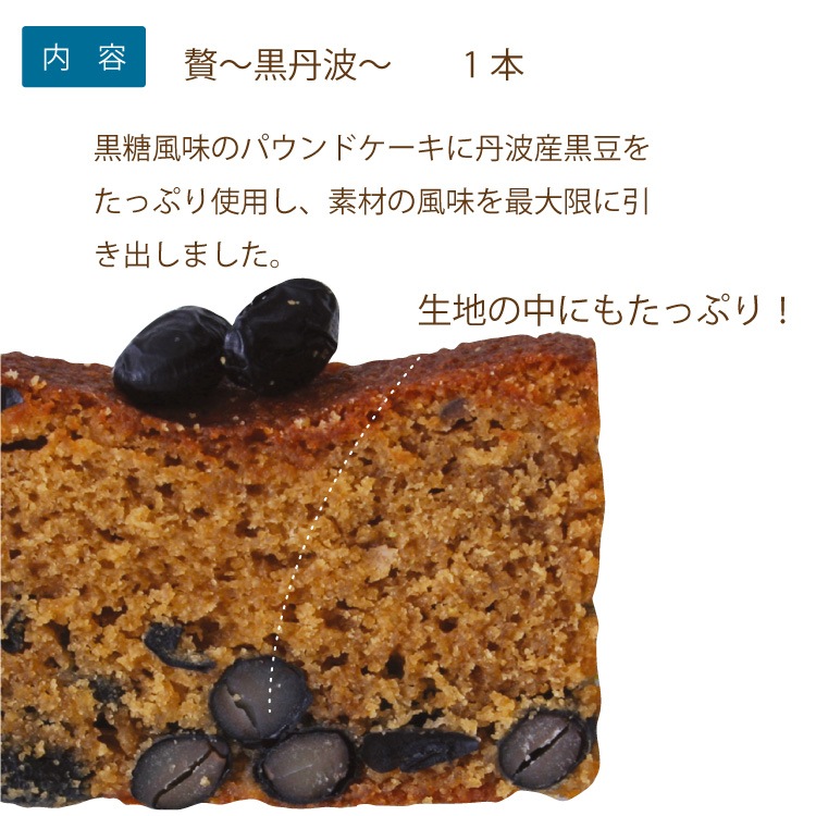 黒糖風味のパウンドケーキに丹波産黒豆をたっぷり使用した贅~黒丹波。