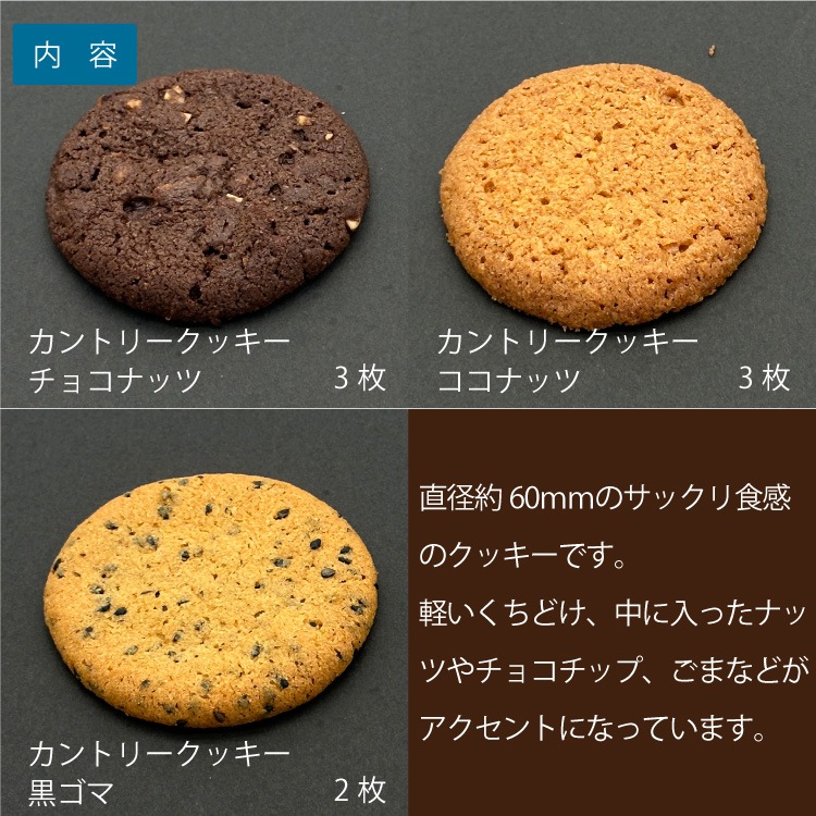 カントリークッキー(黒ゴマ):小麦粉(国内製造)、砂糖、バター、黒ゴマ(国産)、卵、アーモンド、脱脂粉乳/膨張剤