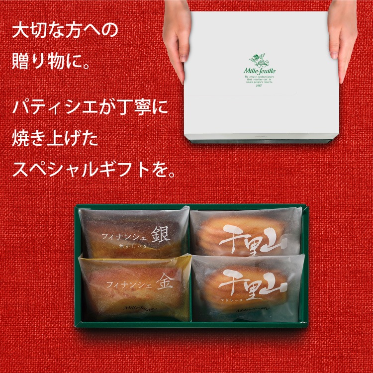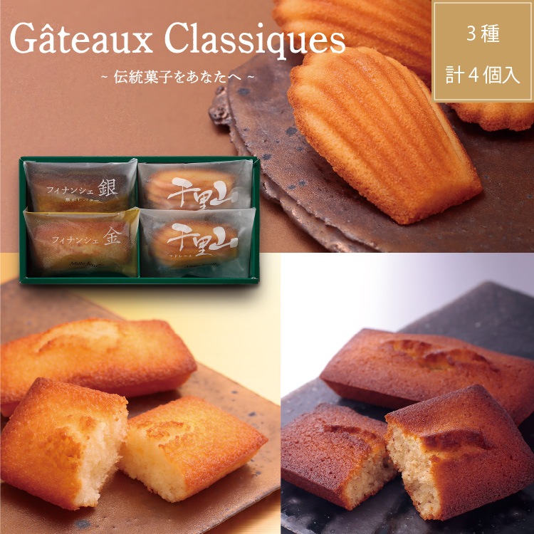 ガトー クラシック(MF-4) 内容量 フィナンシェ金 1個 フィナシェ銀 1個 千里山マドレーヌ 2個 原材料名 アレルギー 乳・小麦・卵・アーモンド 保存方法 直射日光・高温多湿を避けて保存 賞味期限 商品到着後30日以上 配送方法 常温 備考 こんな用途で 進物 御使い物 お礼 ご挨拶 御礼 ご祝儀 祝儀の品 お使い物 ノベルティー 粗品 景品 誕生日 敬老の日 バースデー 結婚記念日 お年賀 パーティー お中元 お歳暮 母の日 父の日 御祝い 内祝い お返し クリスマス イベント