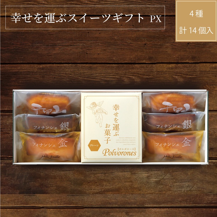 幸せを運ぶスイーツギフトPX 内容量 フィナンシェ金 2個 フィナシェ銀 2個 千里山マドレーヌ 2個 ポルポローネ(プレーン)8個入 1箱 原材料名 アレルギー 小麦・乳・卵・大豆・アーモンド 保存方法 直射日光・高温多湿を避けて保存 賞味期限 商品到着後30日以上 配送方法 常温 備考 こんな用途で 進物 御使い物 お礼 ご挨拶 御礼 ご祝儀 祝儀の品 お使い物 ノベルティー 粗品 景品 誕生日 敬老の日 バースデー 結婚記念日 お年賀 パーティー お中元 お歳暮 母の日 父の日 御祝い 内祝い お返し クリスマス イベント